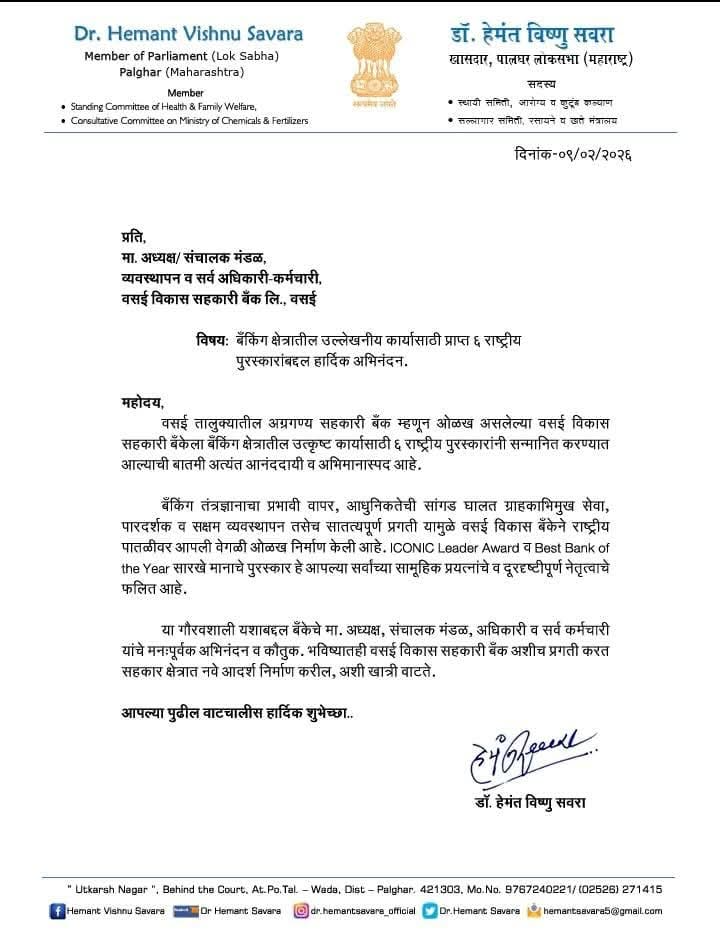 Letter from Dr. Hemant V. Savara (Member of Parliament (Lok Sabha)